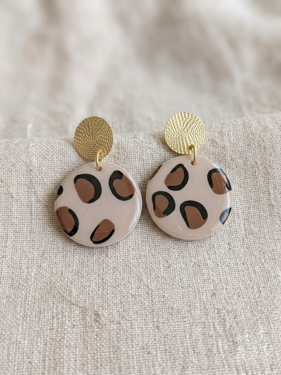Pendentifs : Disques en argile polymère avec motif léopard (tons beige, marron et noir) et finition brillante protectrice.